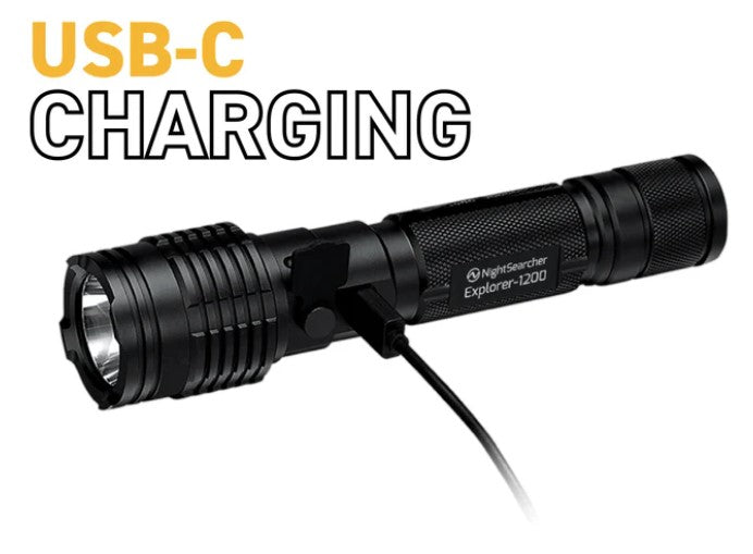 Equipped with six lighting modes, including strobe and SOS, the Explorer 1200 provides versatility for various scenarios, from intense search operations to emergency signalling. The flashlight is powered by a rechargeable 3.7V 2.6Ah lithium battery, offering up to 2.5 hours of runtime at full power and extending to 63 hours in Eco mode. The battery can be quickly recharged using the USB Type C port, ensuring you're never without light for long.