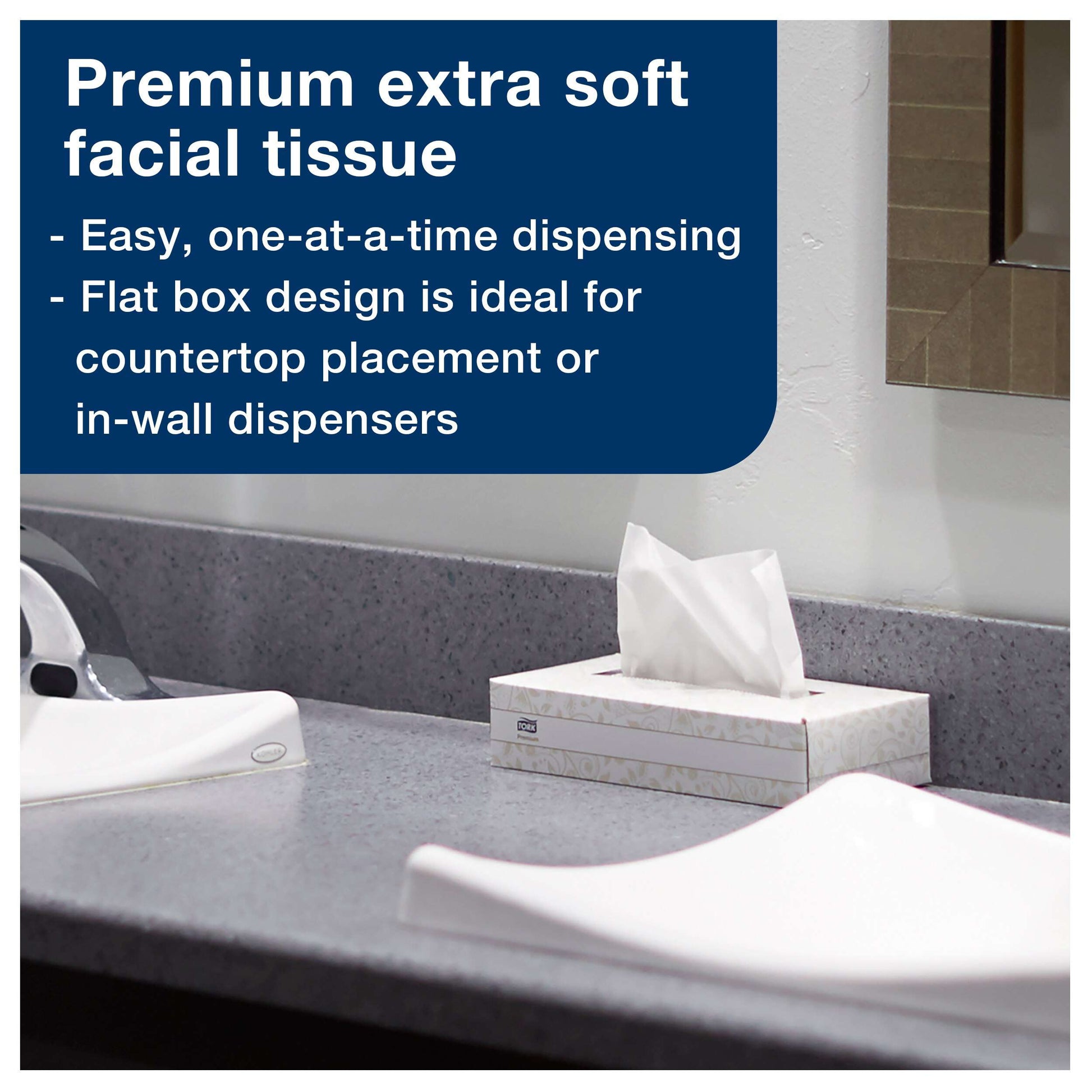 The Tork Extra Soft Facial Tissues deliver premium softness in a flat box to comfort your guests.